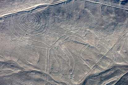 The picture above is an aerial view of the "Monkey", one of the most popular geoglyphs of the Nazca Lines.https://en.wikipedia. org/wiki/Nazca_Lines The Nazca Lines are a group of very large geoglyphs made in the soil of the Nazca Desert in southern Peru created between 500 BCE and 500 CE, and which can best be discerned from the sky. I believe this monkey is associated with the monkeys seen on the Chachapoyas area textile and the Paracas tunic.